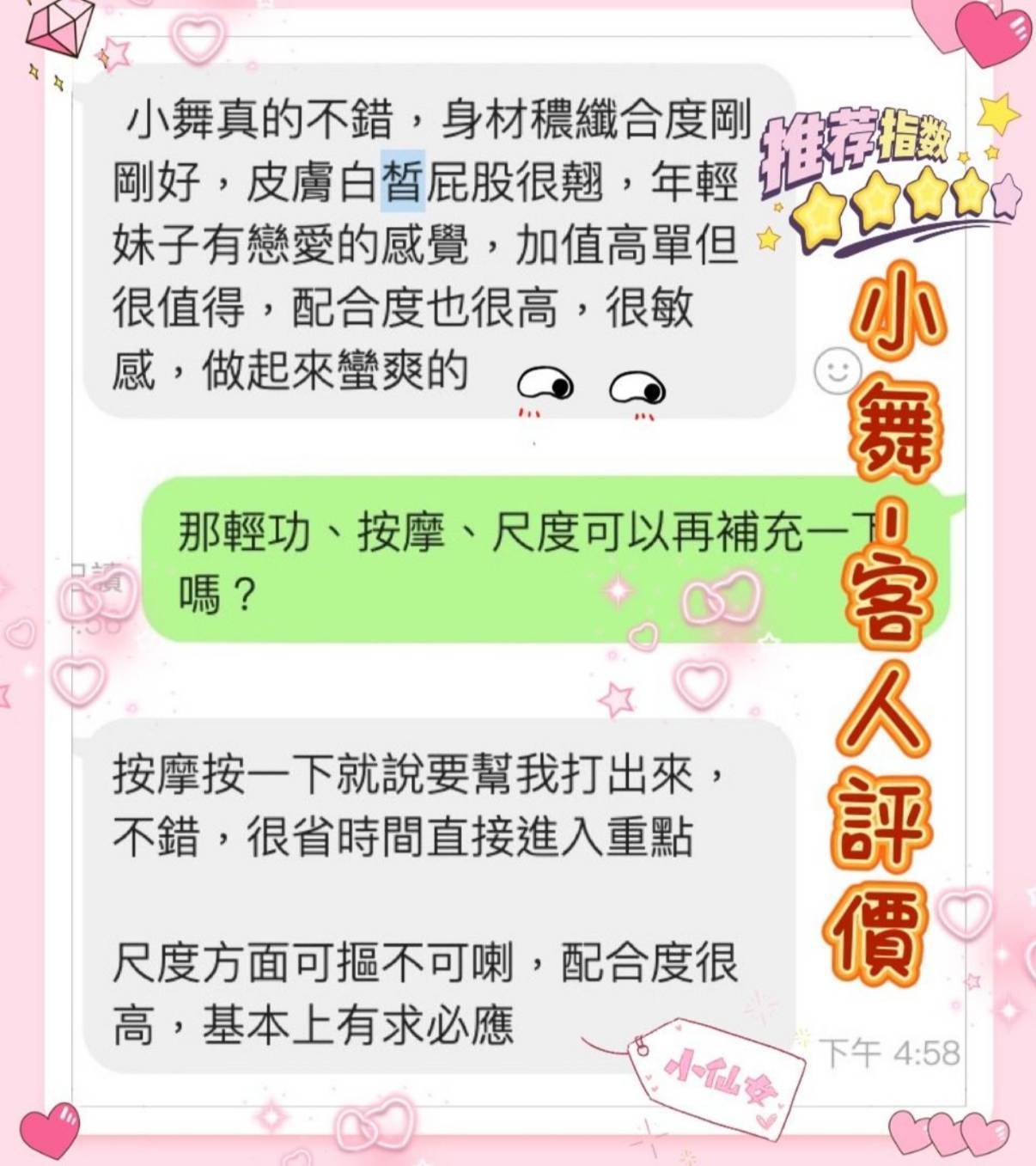 館別 愛館 暱稱 小舞 身材 165.45.C 國籍 台灣 單價 3500 (含包廂費) 時段 13-19