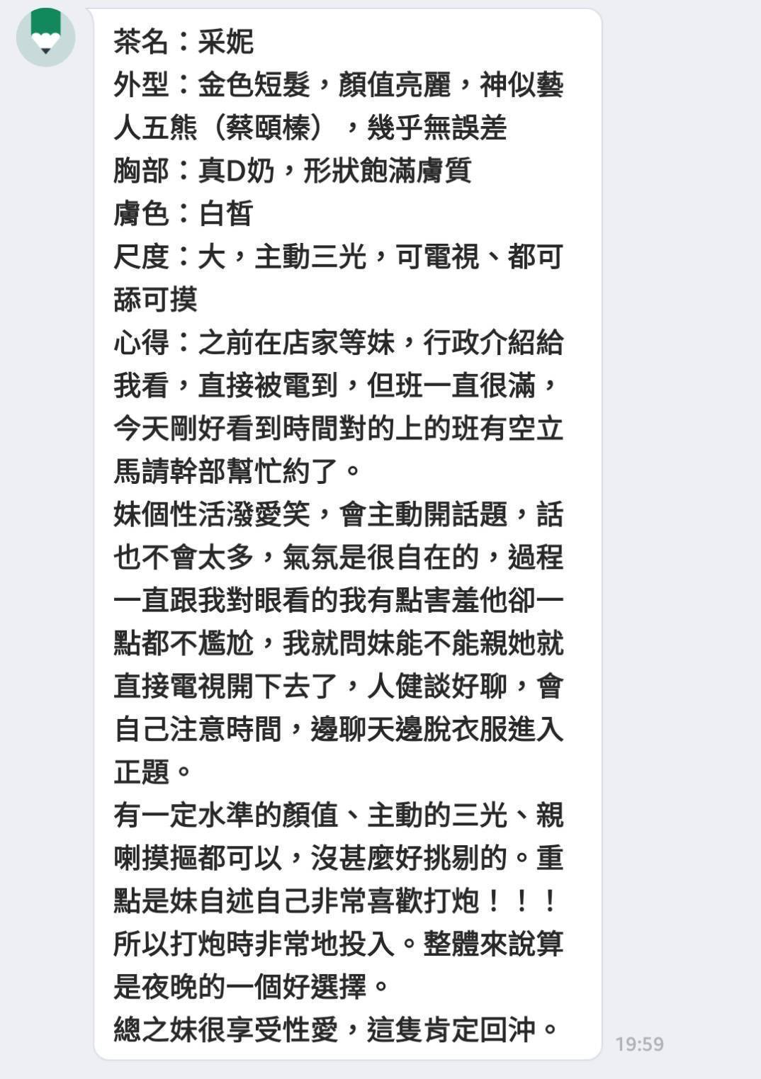 館別 芯館 暱稱 采妮 身材 164.49.D 國籍 台灣 單價 3300 (含包廂費) 時段 12-18